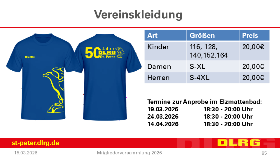 Für alle großen und kleinen Mitglieder der DLRG St. Peter gibt es wieder Vereinskleidung zu bestellen.